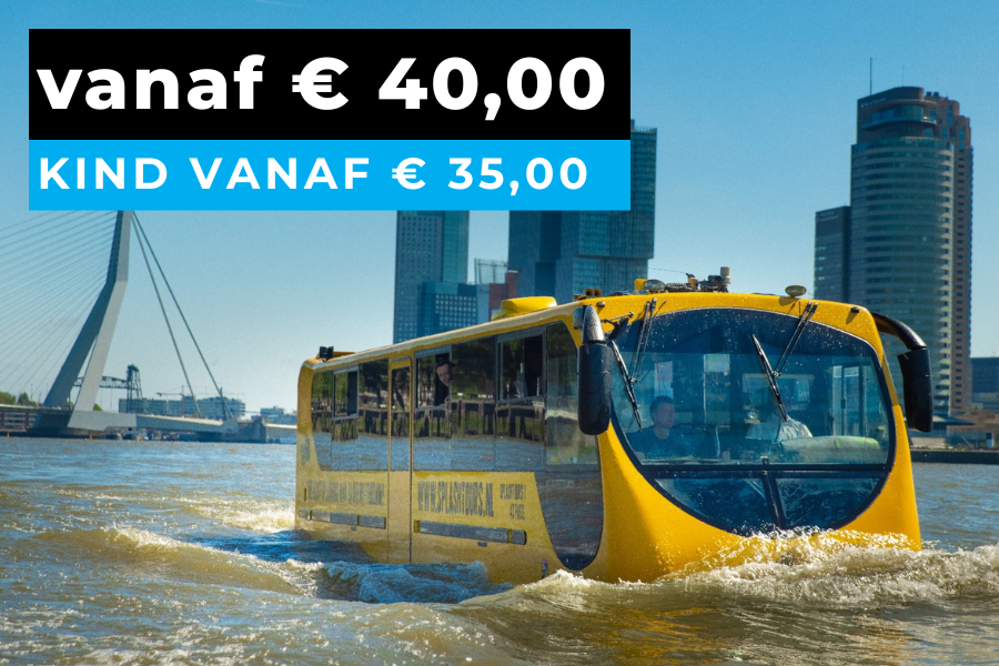Voor de echte avonturiers! Stap aan boord van de Splashtour en beleef Rotterdam op een unieke manier – over de weg én dwars door de Maas. Het hoogtepunt? De spectaculaire splash wanneer de bus het water in rijdt. Een moment dat je niet snel vergeet.